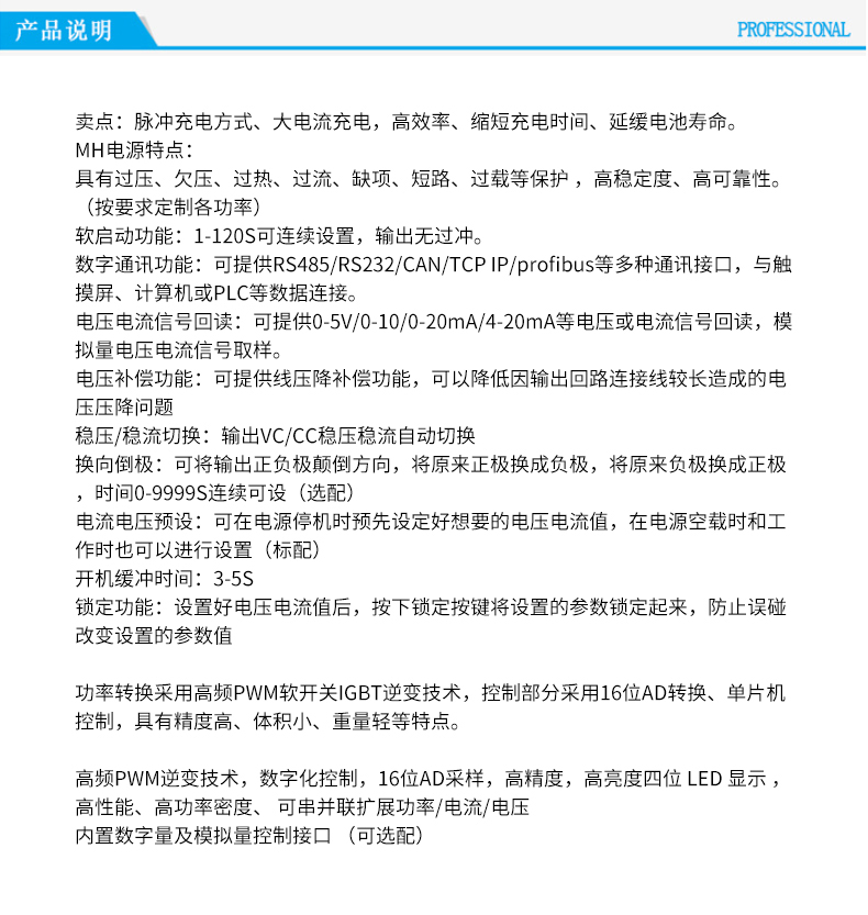 • 功能描述:本充電機(jī)是采用高頻電源技術(shù),運(yùn)用先進(jìn)的智能動(dòng)態(tài)調(diào)整充電技術(shù)。恒流/恒壓自動(dòng)切換,具有充電效率高,操作簡(jiǎn)單,重量輕,體積小等特點(diǎn)。并具有反接、過(guò)載、短路、過(guò)熱等多重保護(hù)功能及延時(shí)啟動(dòng),軟啟動(dòng)、斷電記憶自啟動(dòng)功能等。具有科學(xué)的充電電量控制技術(shù),全自動(dòng)充電機(jī)能在蓄電池充足后自動(dòng)關(guān)機(jī),確保蓄電池充足,不過(guò)充、不欠充,延長(zhǎng)蓄電池使用壽命,全自動(dòng)充電機(jī)可適用的電池類型:鎳鉻、鎳氫、鉛酸、鋰離子電池等。
